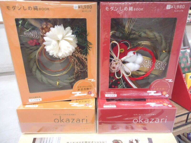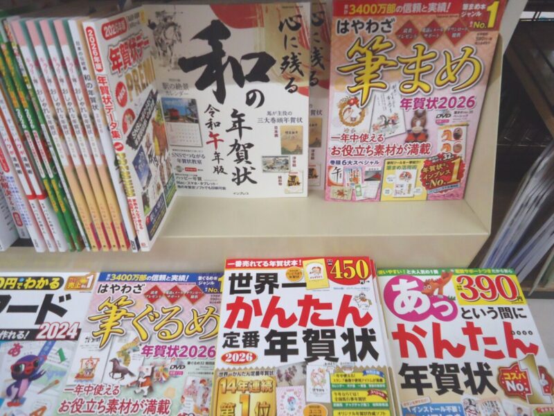 気がつけば今年もあと僅か。この季節がやって参りました。年賀状作成本、入荷中です。400円台から1,000円越えのしっかりした物まで沢山あります。隣接の文具コーナーにはお年玉用ぽち袋、インテリアでも使えるお飾りも入荷しています。是非ご覧ください。